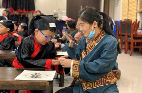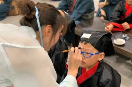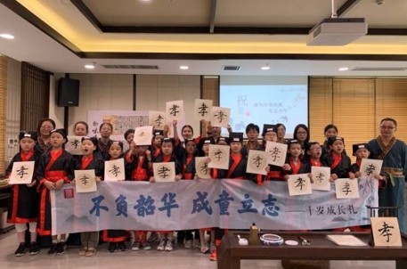 正衣冠、沃盥礼、朱砂启智、拜笔习书。一群即将迈入人生中第一个十年的小朋友们在兰亭景区参加为他们专门定制的十岁成长礼。