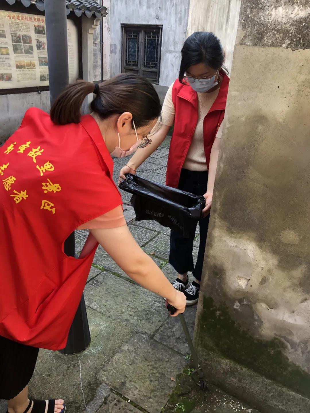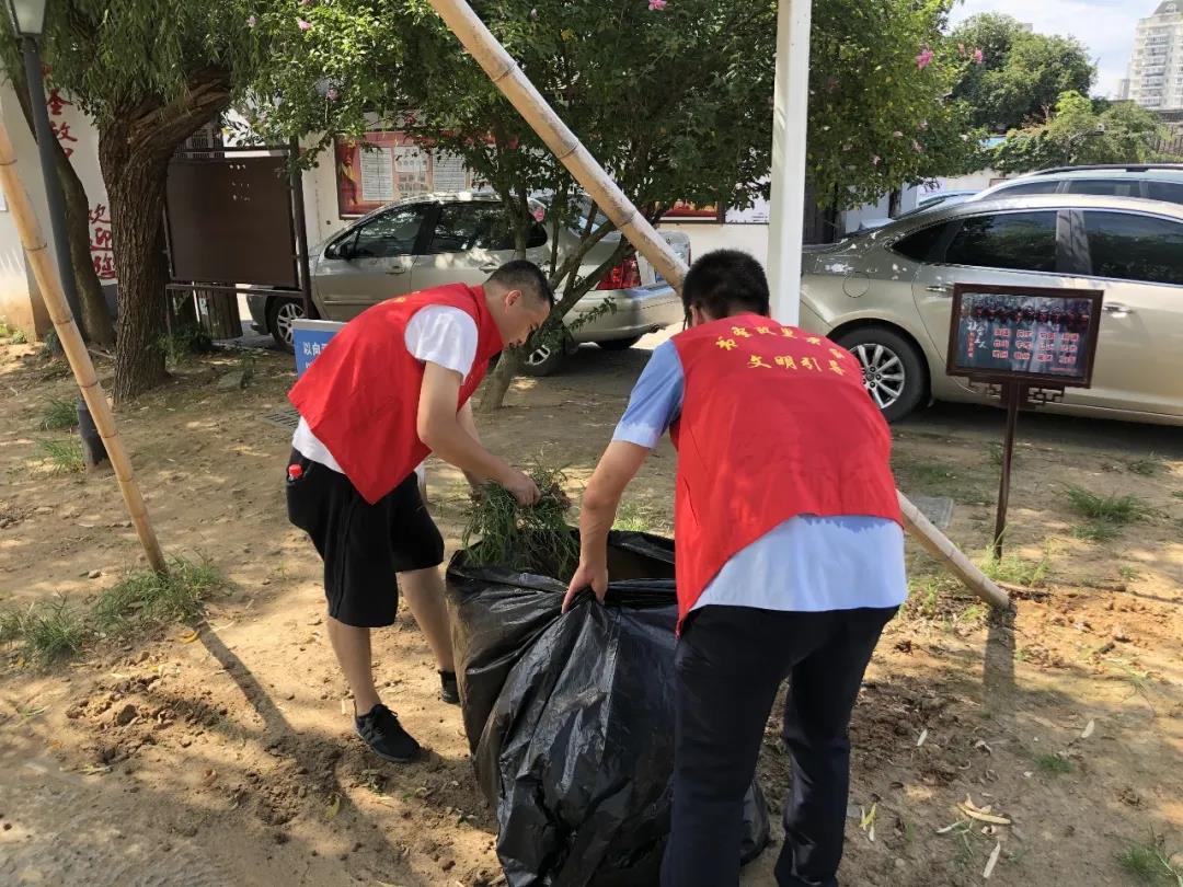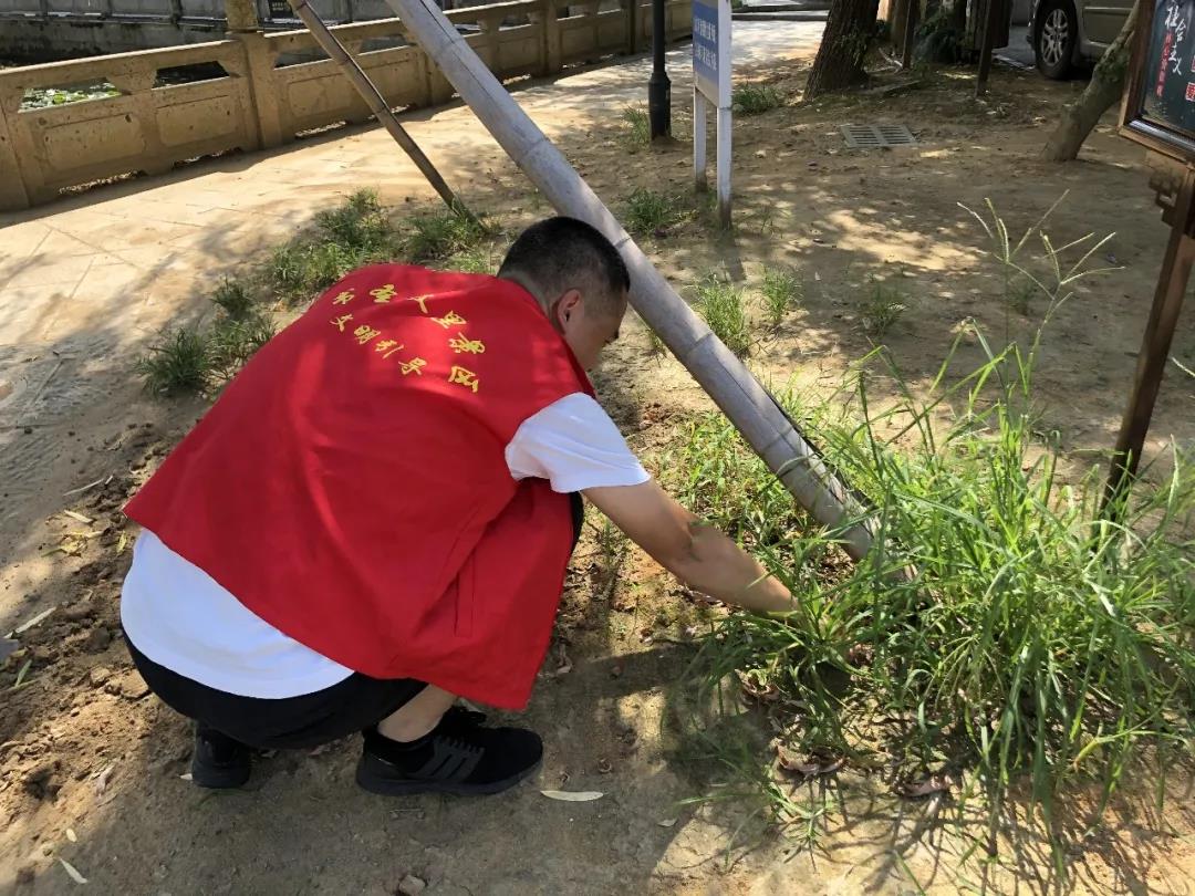 志愿者手拿铁钳、垃圾袋等工具,沿着绿化带、草坪清理杂草,捡拾绿化带内的烟头等垃圾,清扫景区的卫生死角。
