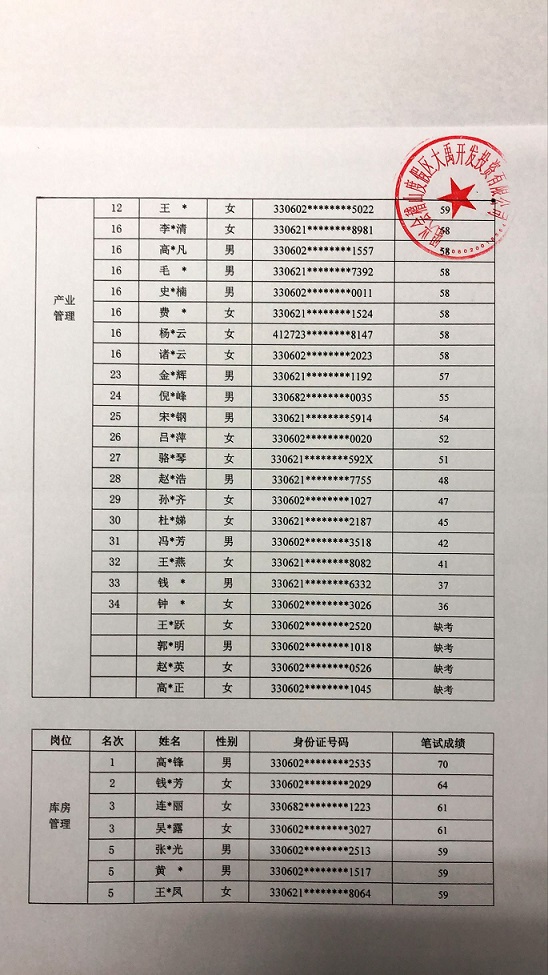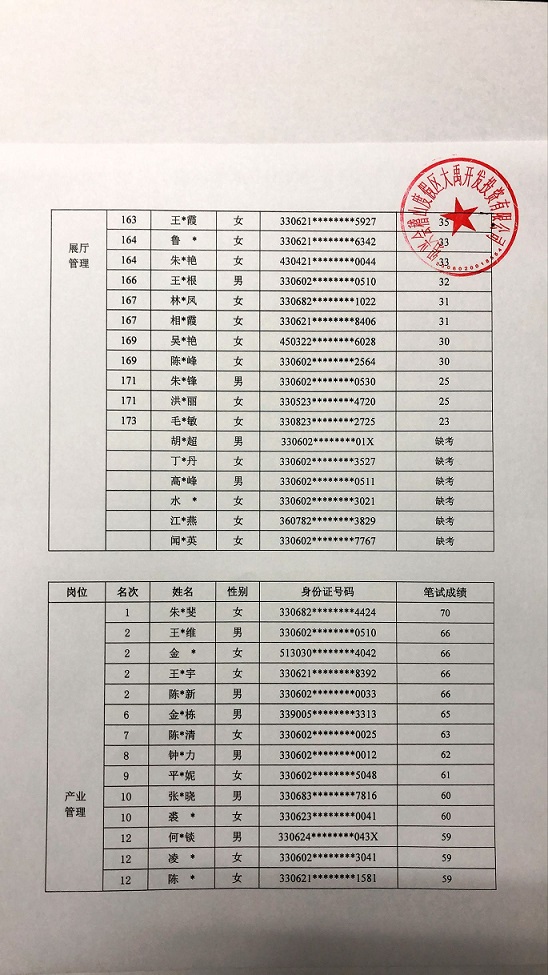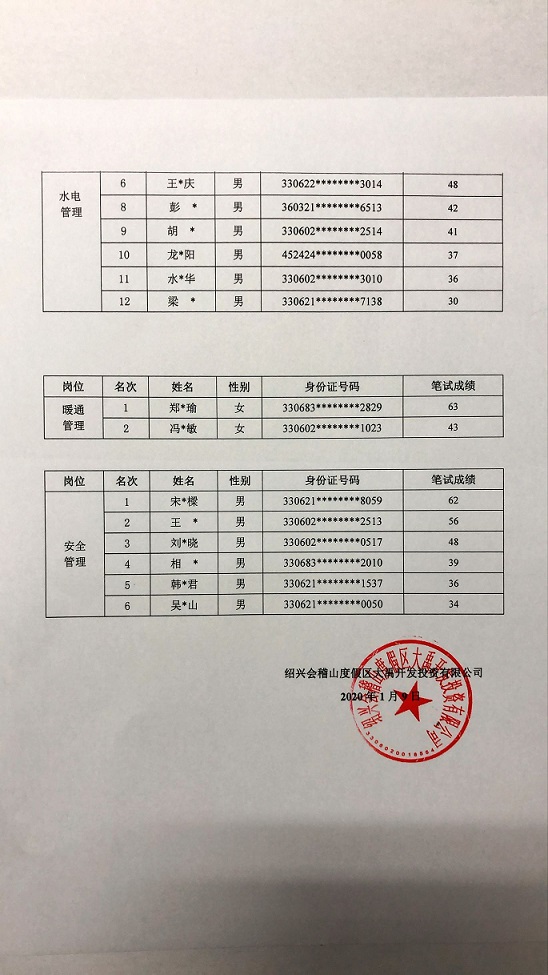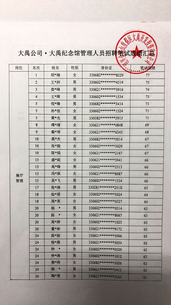 绍兴会稽山度假区大禹开发投资有限公司 大禹纪念馆管理人员招聘笔试成绩公布