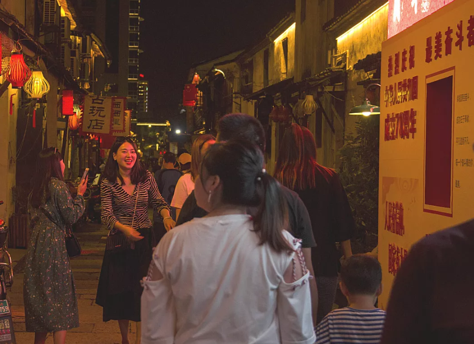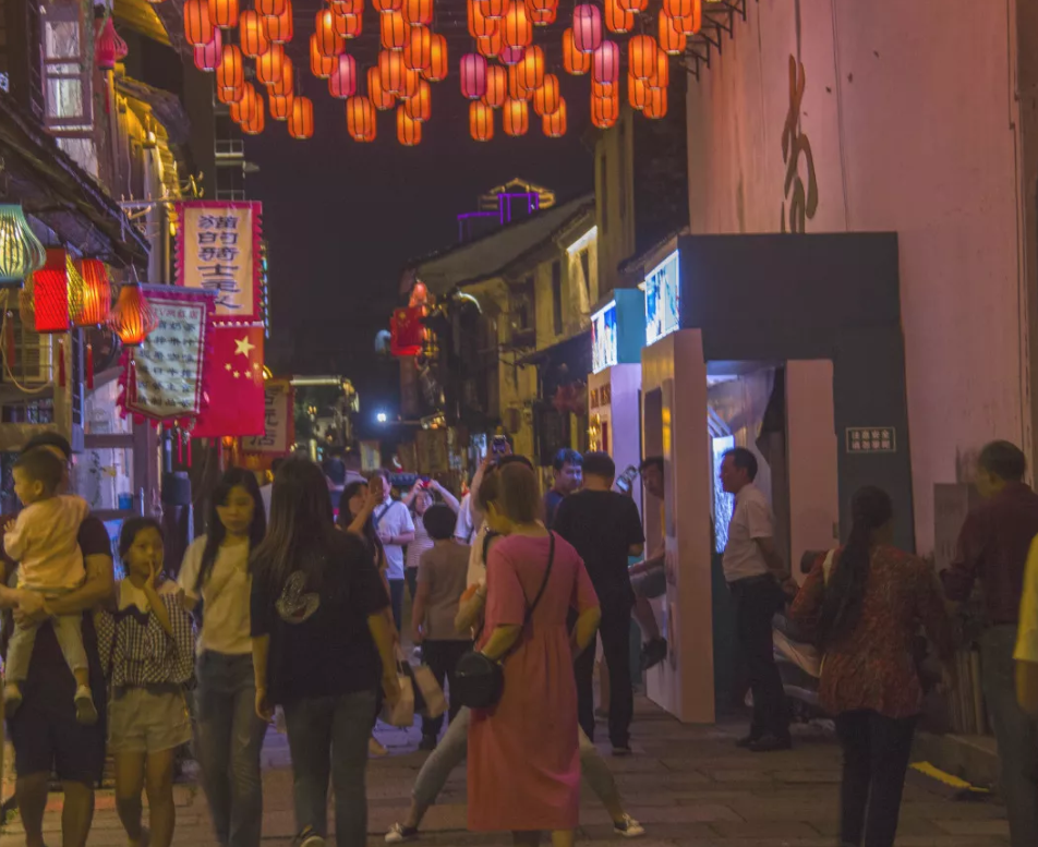 夜幕下的老街灯火阑珊、古韵悠长。街区上,依旧人流如梭,游客们沉醉在古街的霓虹灯光中,流连忘返。