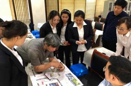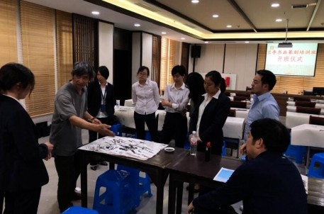 该培训班由景区副主任喻革良和书法研究所研究员陈德洪作为授课老师,于5月9日正式开讲。在开班仪式上,喻主任谈到学习书法的意义目的,以及书法应每日一练,增强对毛笔的熟悉感等,陈老师讲授了篆刻的握刀姿势和用力方法,并以画竹子为例,示范绘画的用笔和线条等。在座的学员们全神贯注,课堂学习氛围浓厚。