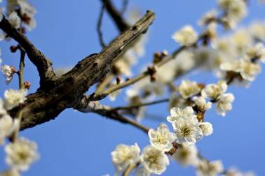 近日气温虽偏低,春天的脚步却依然不动声色地靠近,或许是闻得春之足音,青梅花始开。禹陵神道两侧、池边坡上,都是那洁白的小花,远望霜雪压树,近看星点纷繁。