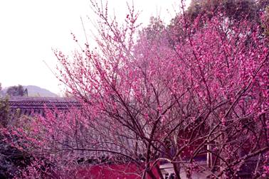 这个时节的禹庙东皋窆石亭下,还有风景独好的“一枝春”——一树红梅,花开正宜。它的树龄已近50年,春近,绽放得更为茂密,古老的会稽山水与红梅梅相映,让人不禁驻足观赏。