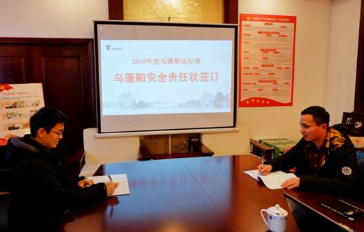 最后,景区副主任王姚威总结2018年乌篷船营运部取得的成绩,提出了安全经营要求,并与乌篷船营运部签订安全责任状。
