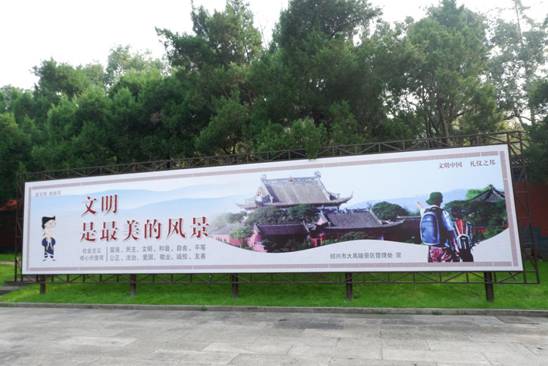 除此之外,景区还着力强化社会主义核心价值观、文明旅游宣传,在游客中心、大入口、景区内,通过喷绘广告、宣传海报、LED电子屏等多形式,引导广大游客融入文明城市创建的氛围中。