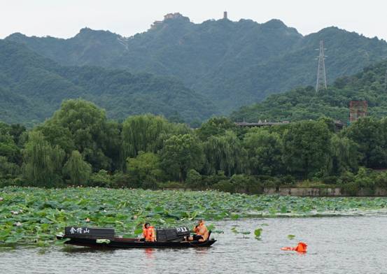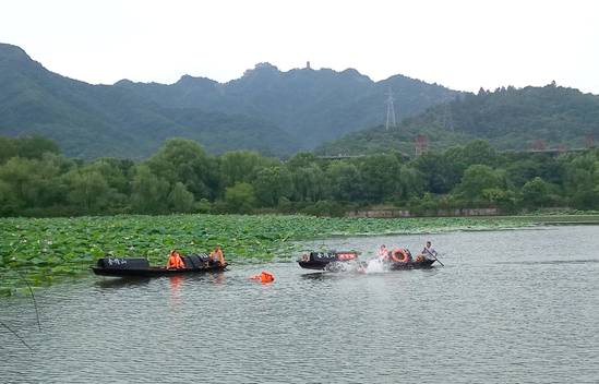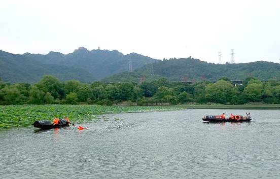 随后,水上救生演练展开。一条载有一对情侣的乌篷船向荷花池划去。
