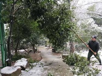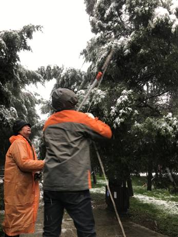 对于大树上的积雪,细心地用竹竿轻轻敲落。散落的雪水使头发上结了冰渣,手和脸都被冻得通红,但这一切丝毫没有影响到大家的干劲。
