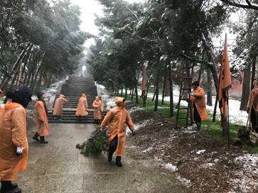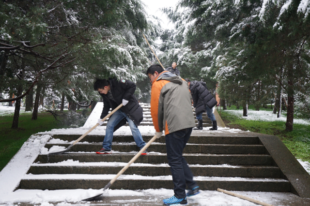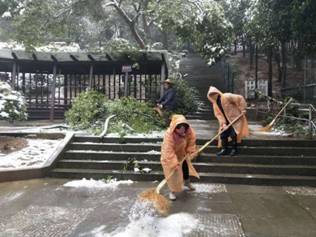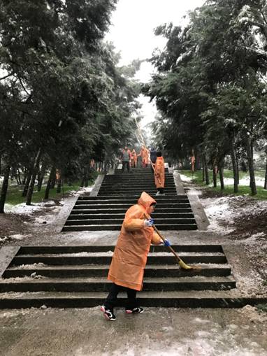 景区的工作人员不畏严寒,积极地投入到扫雪队伍中。