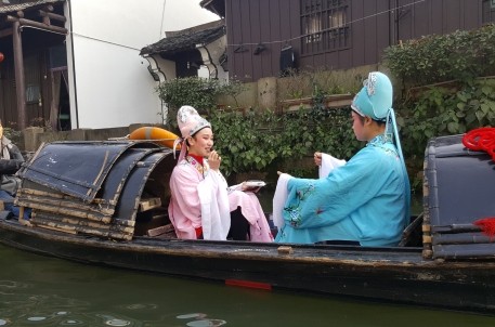 活动期间,鲁迅故里河上两条乌篷船格外引人注目,一条乌篷上两位女孩身着戏服,唱着悠扬婉转的越剧;另一条乌篷船上长发飘飘的女子弹奏着温婉细腻的古筝,引得河岸上的游人纷纷驻足观看,许多人还拿起相机、手机拍个不停,乘船的游客更是络绎不绝。