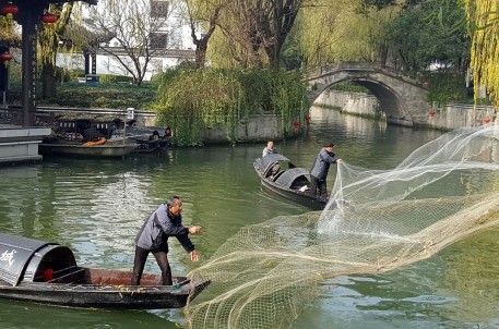 元旦当天,在环山河上,开展了“乌篷迎新”巡游活动。10艘装饰一新的水城乌篷,齐刷刷地划开水面,载着绍兴的美船娘和香醇的老酒,还有来自五湖四海的朋友,一起荡漾在悠悠的水巷中。精彩的撒大网表演,让船上、岸上的游客一片欢腾。戏曲乌篷、古筝乌篷让游客们感受到了老绍兴古朴的风情韵味,乌篷美船娘热情地向游客兜售黄酒、茴香豆、梅干菜等绍兴特产。乘船期间,游客们还能与船老大学说几句绍兴方言,领略一路的绍兴文化。