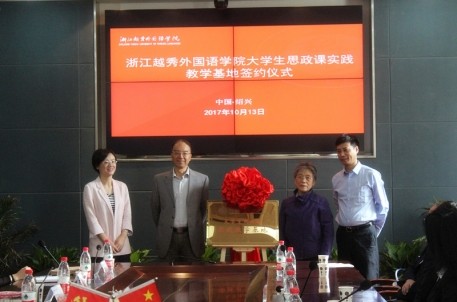 2017年10月13日上午,浙江越秀外国语学院与绍兴市名人故居管理处共建大学生思政课实践教学基地签约仪式在越秀外国语学院镜湖校区举行。周恩来邓颖超秘书、全国政协原副秘书长赵炜女士,绍兴市名人故居管理处主任曾绍晖,越秀外国语学院党委书记费君清、党委副书记施文妹等出席仪式,并为实践教学基地揭牌。