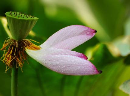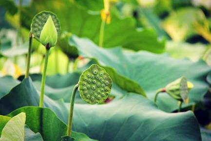 待荷花花瓣渐渐脱落,藏于花瓣之中,娇小嫩黄的花心慢慢成熟,那就是莲蓬。