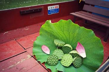这段时间是莲蓬的高产期,工作人员每天采摘新鲜的莲蓬,供坐船游客品尝。
