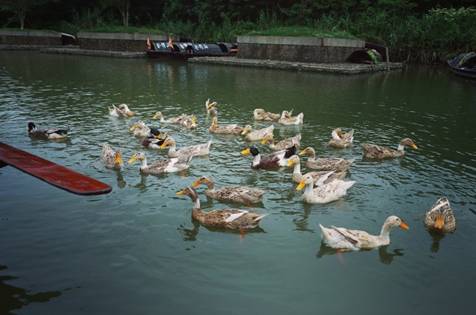 还有一群可爱的野鸭追逐着乌篷船和游客们热情地互动。