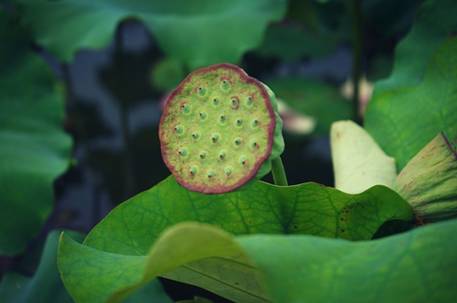 几处荷花凋谢之后变成了清新的莲蓬。