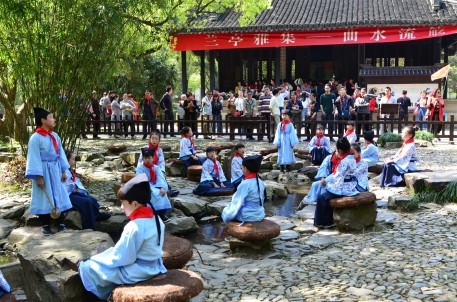 嘉宾们在“兰亭羲之小导游社团”队员的带领下,听鹅池故事、兰亭碑史、访祖孙御碑;体验“曲水流觞”诗词大会;还在临池十八缸前,感受“兰亭少儿流觞书画社”队员的书艺展示;并汇聚鹅池碑亭前,一起吟诵《兰亭集序》,活动内容丰富,来宾们啧啧称赞。