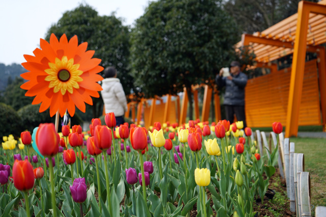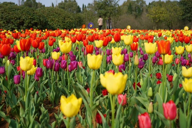 在阳光的滋养下,30万朵郁金香花纵情盛开,交织成五彩花田,游客们沉浸在花海里享受大自然春日最美好的礼物。