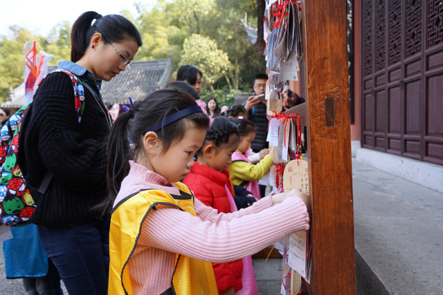 将写有心愿的祈福卡,认真地挂到祈福架上。