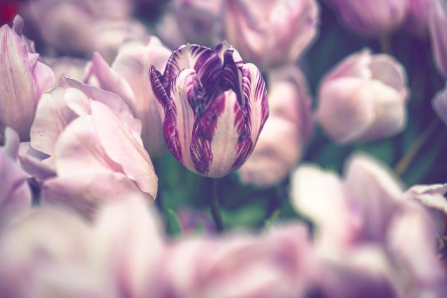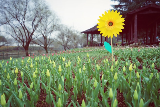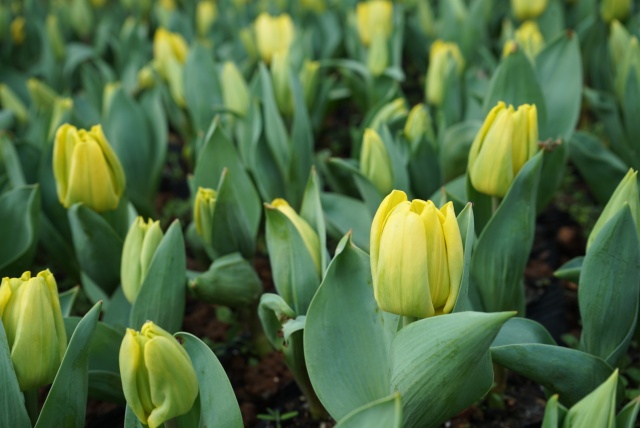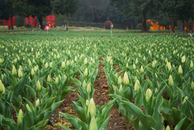 目前花田里早期的郁金香,在春日暖阳的照耀下都有了芬芳前的雏形,含苞待放。