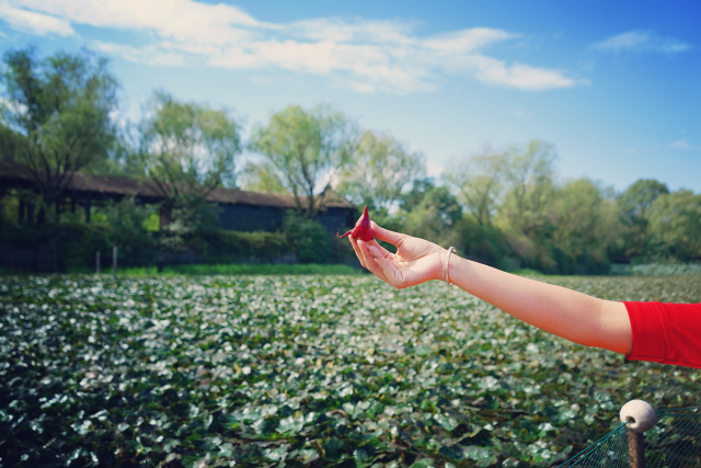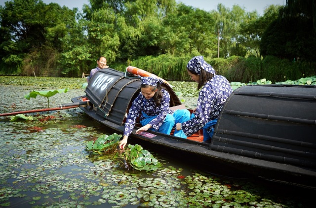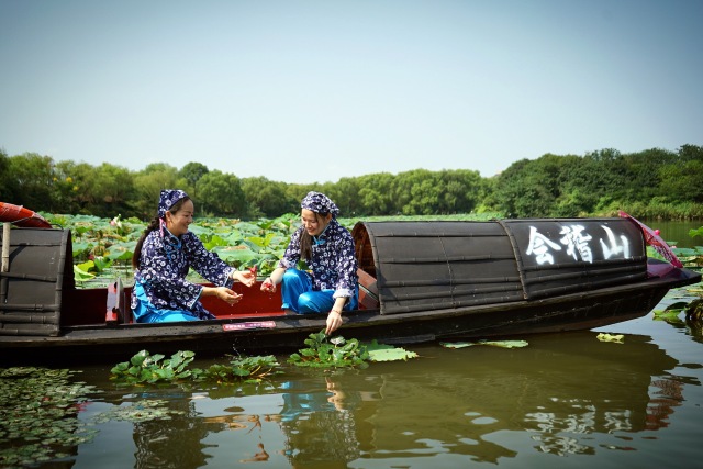 游客朋友们可乘着乌篷船,边品尝新鲜红菱,边观看采菱姑娘的现场表演。