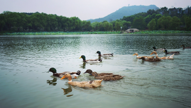 乘着会稽乌篷感受清风徐徐,几处映日荷花,成群的野鸭在池子里嬉水,一派和谐的自然风光。