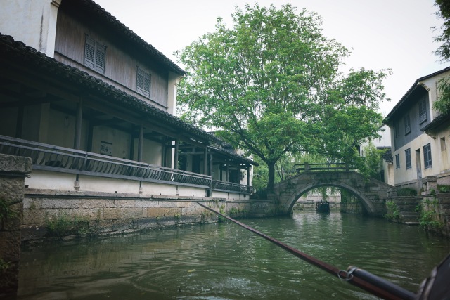 沿着头顶的树枝望向两岸,白墙黑瓦,郁郁葱葱,石块切成的河沿,石板砌成的小道,一路探寻的是粉墙黛瓦的历史,聆听到的是斑驳白墙的故事。