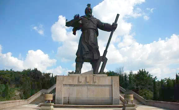 大禹铜像高21米,重118吨,建成于2001年,是大禹治水时亲躬劳作的形象,手持木耜,脚踏巨舟,气势雄伟,屹立在石帆山顶上。