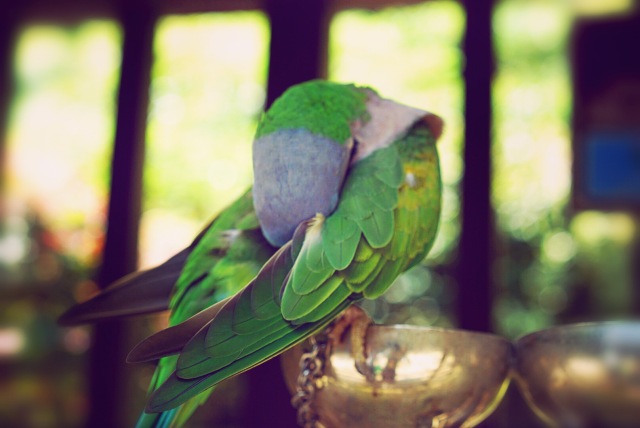 “大绯胸鹦鹉”红嘴、绿背,是所有鹦鹉科鸟类中体形最大的一种。嘿!多看它几眼还害羞地把头躲进了身体里。