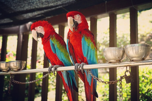 瞧这色彩艳丽的“红绿金刚鹦鹉”,喜欢成对活动的它们可是景区的小明星,宣传海报上都有它们的身影。虽然长着有力的喙,但对人绝对友善。