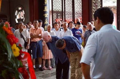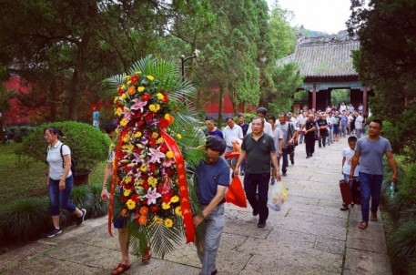 农历六月初六,是古代治水英雄,华夏人文始祖—大禹诞辰纪念日。 来自姒族守陵村村民和各地的大禹后裔代表齐聚大禹陵,隆重举行2016大禹诞辰民间祭祀活动。上午9时18分,在鞭炮声中,百余人着正装,抬着牛、羊、猪头,五谷杂粮,水果等祭品,从守陵村出发,手举姒族祭禹旗帜,浩浩荡荡前往大禹陵禹庙大殿祭祀。9 时50分,祭祀活动正式开始。全体肃立、鸣礼炮、敬献祭品、敬献花篮、绍兴市姒族研究会会长、大禹第143代孙姒茂利诵读祭文,后裔族人姒姓、夏姓、鲍姓、禹姓、娄姓代表先后向大禹像鞠躬、敬香,代表全体大禹后裔向祖先行礼,以祈求来年风调雨顺,五谷丰登。现年86岁的鲍姓代表激动地说:“每年六月初六,我们都要自发组织祭祀大禹活动,整个场面庄严隆重。大禹是我们的保护神,老百姓纪念他,一来表达我们对大禹的崇敬和缅怀之情,二来祈求来年风调雨顺。”