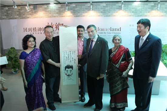 座谈会后,双方代表参观了正在绍兴鲁迅纪念馆展出的“回到精神的故乡”——刘春杰鲁迅视界作品展”,中国当代版画艺术家刘春杰先生将自己在昨晚连夜创作的一副鲁迅肖像水墨画赠送给了参加大师对话的泰戈尔后代。