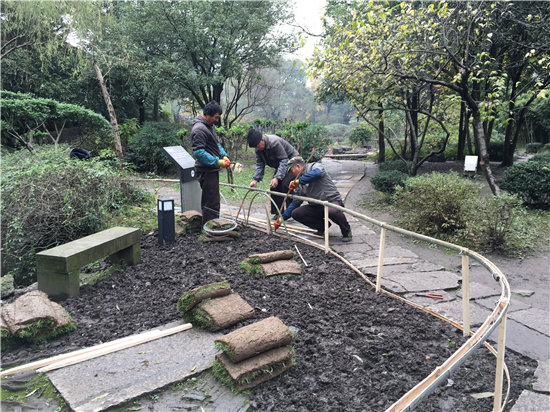 近日,景区组织人员,对沈园部分游步道附近绿地进行改造,增设隔离带,防止游客踩踏,铺设草皮,恢复绿地景观。目前,改造工程正在紧张进行中,古迹区部分游步道边已重现绿意。
