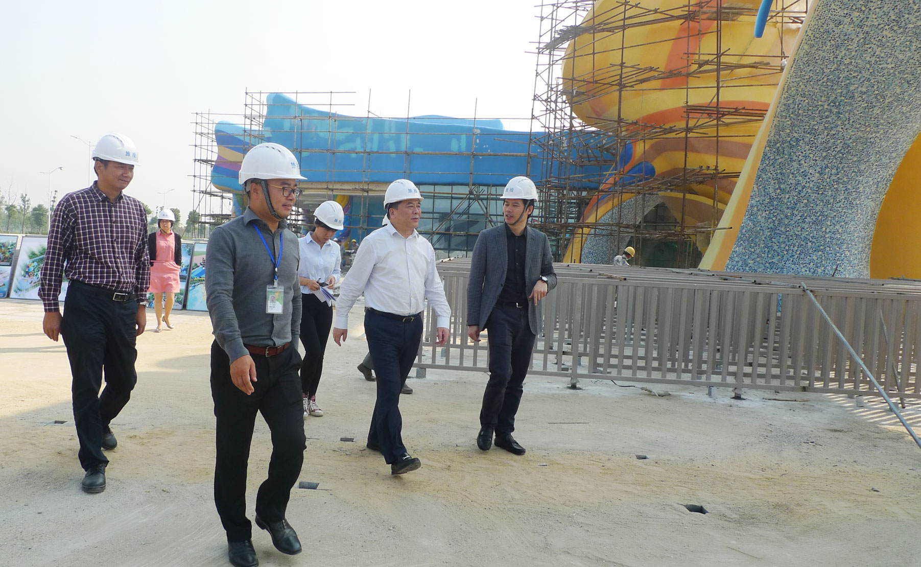 10月13日上午,绍兴市副市长杨文孝、市经信委主任黄坚、市发改委副主任王辉等在市旅游集团副总经理沈伟庆等陪同下,实地踏看了镜湖旅游综合体一期工程水公园项目现场,对主题乐园项目规划、后续运营提出了建设性意见,要求围绕旅游六要素,加强和完善配套设施建设,进一步做好产业延伸文章。