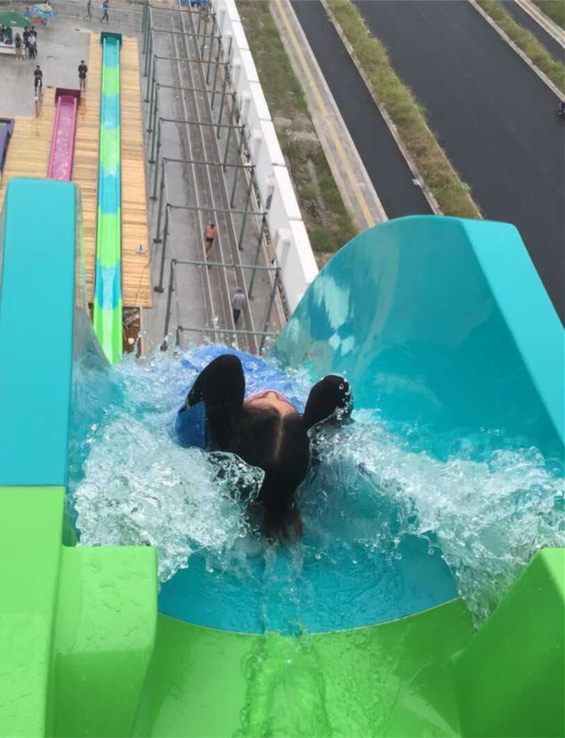 巨浪来袭共有6条滑道,其中当属高速敞开滑道最刺激。当你站在高约25米,与平台近乎垂直的出发口时,积攒了多时的勇气可能会被瞬间带走。你可能会犹豫不决,摇摆不定,然而经验老道的操作员的鼓励将成为你此时最大的动力,恐惧不算什么,敢于突破就是胜利!于是你缓缓躺下,两眼望着天空,双手抱着头部,耳边尽是水流的声音。在确定准备就绪后,操作员轻轻一送,你便开始了一次自由落体的旅程,身体由平躺变成了竖直,眼中的风景因为快速移动而变的模糊。你仿佛瞬间进入到了另一个世界,两脚悬空和高速下落带来的刺激已经让你叫不出声音,接近落地的时候眼睛一闭,脑袋一片空白,等回过神来整个人已经浸没在了滑道内的水里,之后你本能的坐起,摇晃走走出滑道。