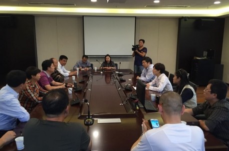 在认真收听讲解员景区介绍后,景区副主任喻革良与来宾们在会议室座谈,并就书法博物馆设计理念、陈列意图、节会活动方面情况做重点介绍。