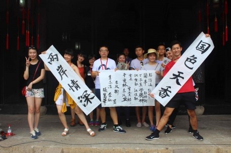 在王右军祠内,景区副主任喻革良老师为学生们上了一堂简短而又妙趣横生的书法课。喻主任将自己20多年潜心学习书法的心得和同学们做分享和交流。即:晋朝著名书法家卫夫人教导书圣王羲之练习书法的方法:“‘点’要如高峰坠石,‘横’要如千里阵云,‘竖’要如万岁枯藤”。简简单单三句话,却道出了古人练习书法的真谛:从自然中来,还原自然本真。虽正值盛夏,天气炎热,但同学们依然热情高涨,饶有兴趣地参与书法体验活动,还把喻老师分享的书法小知识运用到接下来的描红体验中,并把参与活动的心声写在了宣纸上。