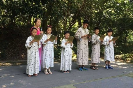在简短的开营仪式上,苏州姑苏区书画协会理事蒋奶奶就书法艺术传承的必要性和青少年书法培训的重要性做了循循善诱的发言,随后,景区分管领导冯烨向学生代表授予营旗,挥动着鲜艳旗帜,丰富而有精彩的兰亭修学游随之拉开帷幕。