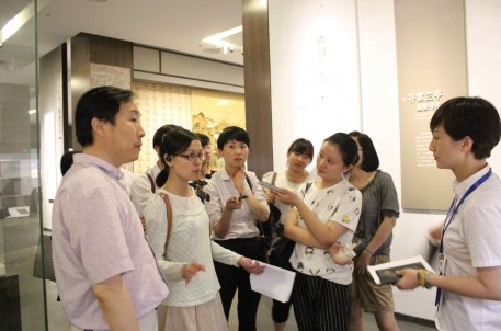 在大厅,徐教授首先阐述了博物馆讲解工作的重要意义,希望并鼓励全体讲解员能敬业爱岗,刻苦钻研,以亲切、亲近、轻松的方式讲解专业、深奥和富有内涵的博物馆知识和主题;要学会从问题找答案,并给人以启迪。即:“建造博物馆的目的是什么;展览想告诉大家什么,展览和当今生活的联系…”。