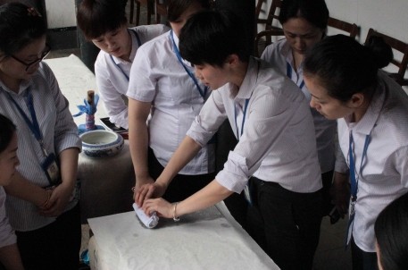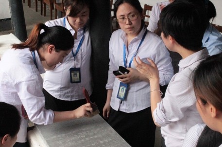 拓印是我国古老的传统手工技艺,通过现场演示,进一步培养了讲解员对书法艺术浓厚的兴趣爱好,也能引导讲解员在今后的讲解过程中抛去空洞和死记硬背的讲解模式,通过亲身体验生动阐述书法理念,与广大游客和书法爱好者产生良好的书法共鸣。