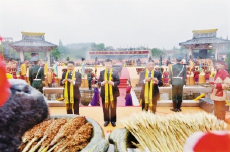 鼓乐声中,主祭人依次登上祭台,向先祖献上祭酒。