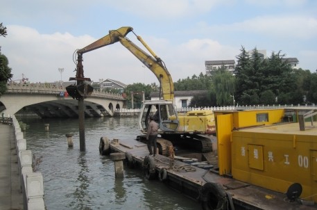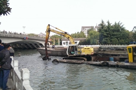 10月23日,环城河公司与市交通局、市水利局等几个相关部门相约会商,专门就此事召开协调会。在协调会上,几个部门负责人达成共识,大家均表示将尽快把这批水泥柱子拔除。在交通、水利部门的评估工作完成之后,我公司负责具体实施并落实相关资金。我公司确定了市内一家专业公司负责施工作业,10月28日上午8点左右,施工队伍来到现场,其中一只船装有拔除水泥柱的大型抓机,另一只船安放运输被拔出来的水泥柱子。8点50分,第一根水泥桩被挖机稳稳地拔出水面,至中午12点多全部拆除完毕。这些被拔除的水泥柱长度大概5.5米左右,其中水下2米多。