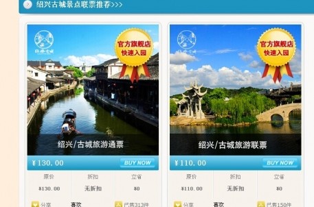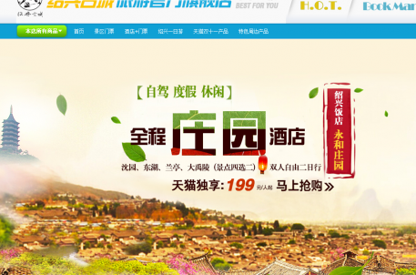 导航分列为景区门票、酒店+门票、绍兴一日游、天猫双十一产品及特色周边产品五大板块。同时,我们在主页