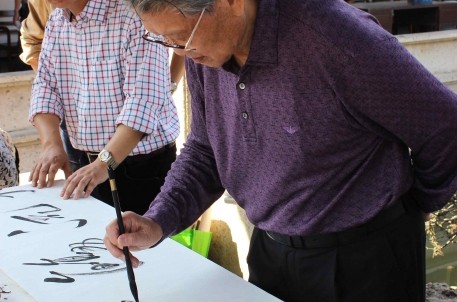 参观最后,首长在王右军祠墨华亭内为兰亭景区题写了“曲水流觞”四个大字以作纪念,并和绍兴当地的书法老师现场书艺交流,研磨书道,尽兴开怀。