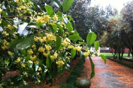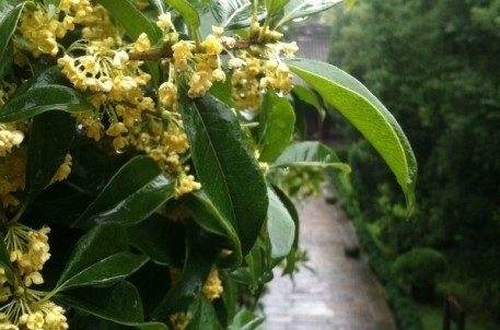 如果说万物有灵,那就让我想象桂花神的模样吧:一个美丽的女神,挥挥衣袖,千朵万朵的桂花就齐齐的开放了。想象在秋阳明媚的日子里,金色的花朵躲在绿叶下,羞涩的开放。那躲在叶底开放的花儿,像极了情窦初开的女子,不张扬,不献媚,却犹抱琵琶,半遮半掩,半羞半嗔,掩不住的姿色容颜,遮不住的香韵悠远。这样内敛与含蓄的花儿,如何让人不喜欢?