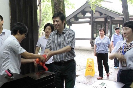 8月8日,绍兴市旅游集团董事长沈安龙带领班子成员前往景区慰问奋战在高温一线的景区工作人员。 在兰亭景区,沈安龙董事长亲切慰问奋战在烈日下工作的员工,与景区工作人员握手,并送上了防暑降温慰问品。在关心慰问的同时,沈董不忘叮嘱员工多休息,合理安排工作时间,又适时、适地地向景区的管理人员们提出了多项建议,以确保防暑降温工作的顺利展开,做到安全、有序。 领导们的慰问和关怀,极大地鼓舞了员工们的工作热情,大家纷纷表示,要战高温抗酷暑,圆满完成自己的工作。