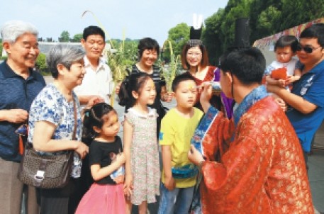 “五月五,是端午;门插艾,香满堂……”今天上午,在会稽山景区祭禹广场,工作人员身着古装,在向前100名到来的游客分发香囊和菖蒲,并为小朋友们在额头上画了“王”字。据了解,这个绍兴民间习俗一是驱毒,二是镇邪(“王”似虎的额纹,又虎为兽中之王,因以代虎),让游客体验源远流长的绍兴民俗文化。 ——摘自6月2日《绍兴晚报》 记者 石皎月