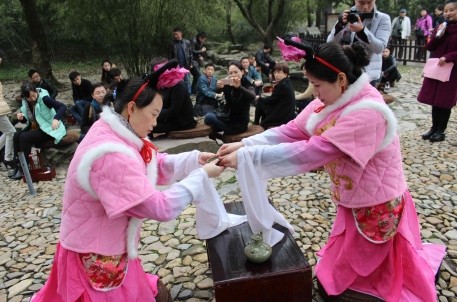 众人到达景区后,径直来到著名的曲水流觞景点,参加新版流觞演艺体验活动。晋圣,沐手,焚香,流觞,小游戏环节紧紧相扣,欣赏性和参与性协调渐进。尤其是新增的酒礼环节,让大家一饱眼福:主宾敬酒,少长敬酒,女子之间相互敬酒,侍女优雅的演绎赢得了大家的掌声。落坐来宾也纷纷效仿,行古人之礼,享古人之乐,现场氛围十分和乐。