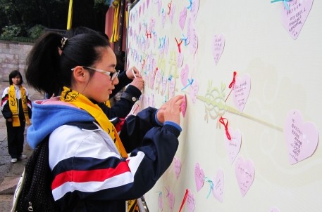 上午九点,同学们在景区讲解员的带领下前往大禹陵享殿举行祭祀圣祖大禹典礼,大家认真聆听了大禹陵相关历史知识和祭祀典礼的传承与意义,随后戴上佩巾,伴随古朴庄重的颂歌,全体同学肃立雅静,面向大禹神位三鞠躬,表达对大禹的尊重和崇敬。整个典礼庄严肃穆,同学们亲身体会到炎黄子孙对华夏先贤的绵绵追思,深刻领悟了大禹坚忍不拔,公而忘私的奉献精神。大家纷纷在许愿卡片上写上自己对祖国对家人的祝福心愿。祭典仪式结束之后,同学们在景区工作人员的引导下,纷纷填写了文明志愿者报名表,大家希望用自己青春的力量,给与社会更多的帮助和关爱,使自己成为一名有爱、友善、有责任心的好青年。