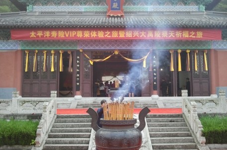 28日清晨,金华地区太平洋寿险VIP尊荣体验之旅暨绍兴大禹陵祭天祈福之旅在大禹陵隆重举行。来自金华地区的参祭人员由神道缓步进入大禹陵,在享殿开始祭禹仪式。7点10分,仪式正式开始,祭禹司仪掌握整个流程,主祭人敬香、敬酒、参拜,参祭人敬香、参拜,前往大禹陵禹庙大殿敬香、参拜,最后来到祭禹广场,敲响平安钟祈福。在景区工作人的协助与引导下,整个仪式在隆重庄严的氛围中有条不紊开展并顺利结束。