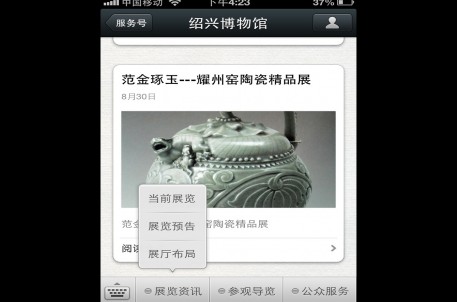 随着公众微信号的服务号与订阅号分设,日前,绍兴博物馆官方微信进行了升级,从单一的语音导览增加到展览资讯、参观导览、公众服务信息三大部分内容。观众关注绍兴博物馆官方微信,即可获取绍兴博物馆开放时间、领票信息、展览/讲座信息、展览讲解、查询交通/咨询电话等,可以完全掌握博物馆的服务资讯。